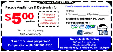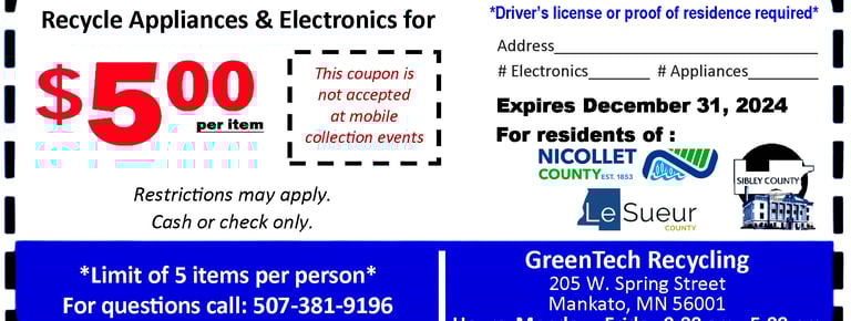 Lesuer County residents can now use this coupon to recycle TVs and appliances for $5.00 each (up to 5 items) at GreenTech Recycling in Mankato (205 W. Spring St.). Coupons may be presented on a mobile device or printed off. View the coupon for additional details, please note that this coupon will NOT be accepted at the mobile collection event in June. See the document below for a list of mobile collection dates for residents of Le Sueur, Nicollet, and Sibley Counties.